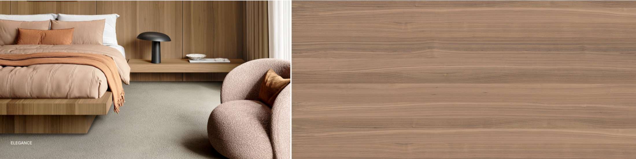 ● Symphony Infinite : ce décor repose non pas sur un placage bois véritable, mais sur un placage reconstitué . Ce procédé consiste à utiliser un bois clair type peuplier, le teinter puis le recomposer afin de créer un dessin régulier et reproductible proche du noyer. Là où le placage véritable reflète les singularités uniques de chaque tronc, le reconstitué garantit une uniformité totale. Symphony Infinite conserve l’esprit visuel du noyer tout en assurant une continuité idéale sur de grandes surfaces, comme des panneaux décoratifs noyer ou des ensembles de mobilier coordonnés.